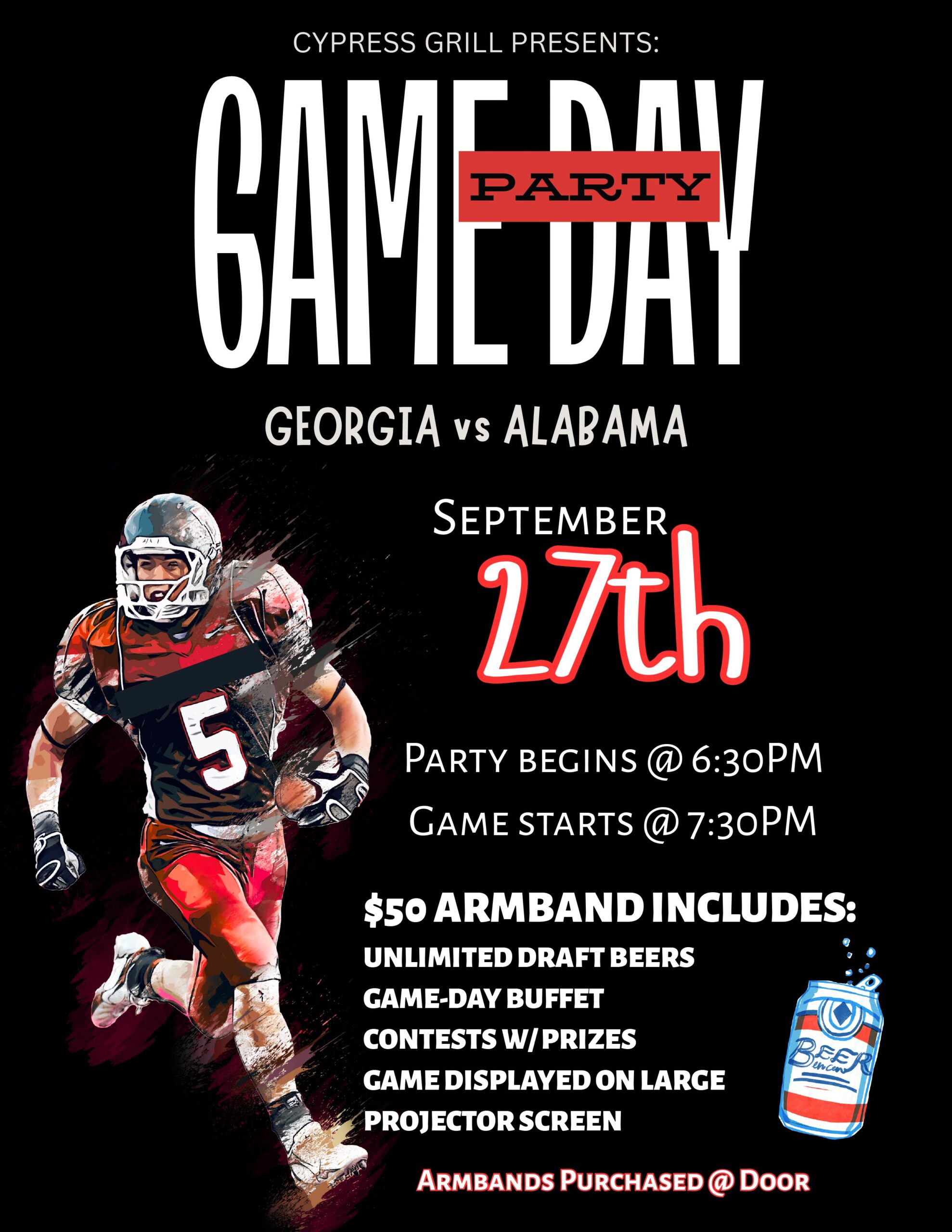Join us in Cypress Grill for a Georgia vs. Alabama Watch Party. Party starts at 6:30pm. Kick-off at 7:30pm. Food and drink specials available during the game! Purchase a $50 armband at the door and get unlimited draft beer, game day buffet, contests with prizes and so much more!