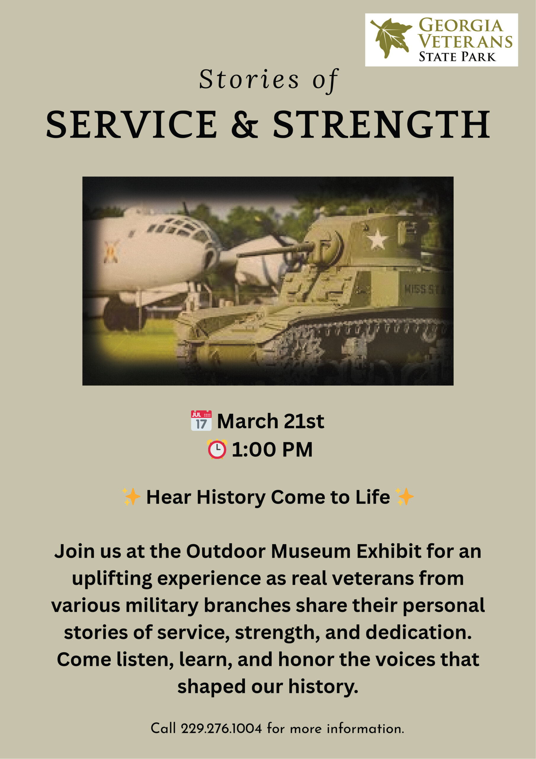 Join us at the Outdoor Museum Exhibit on Saturday, March 21, 2026 at 1pm as real veterans from various military branches share their personal stories of service, strength and dedication. Come listen, learn and honor the voices that shaped our history.