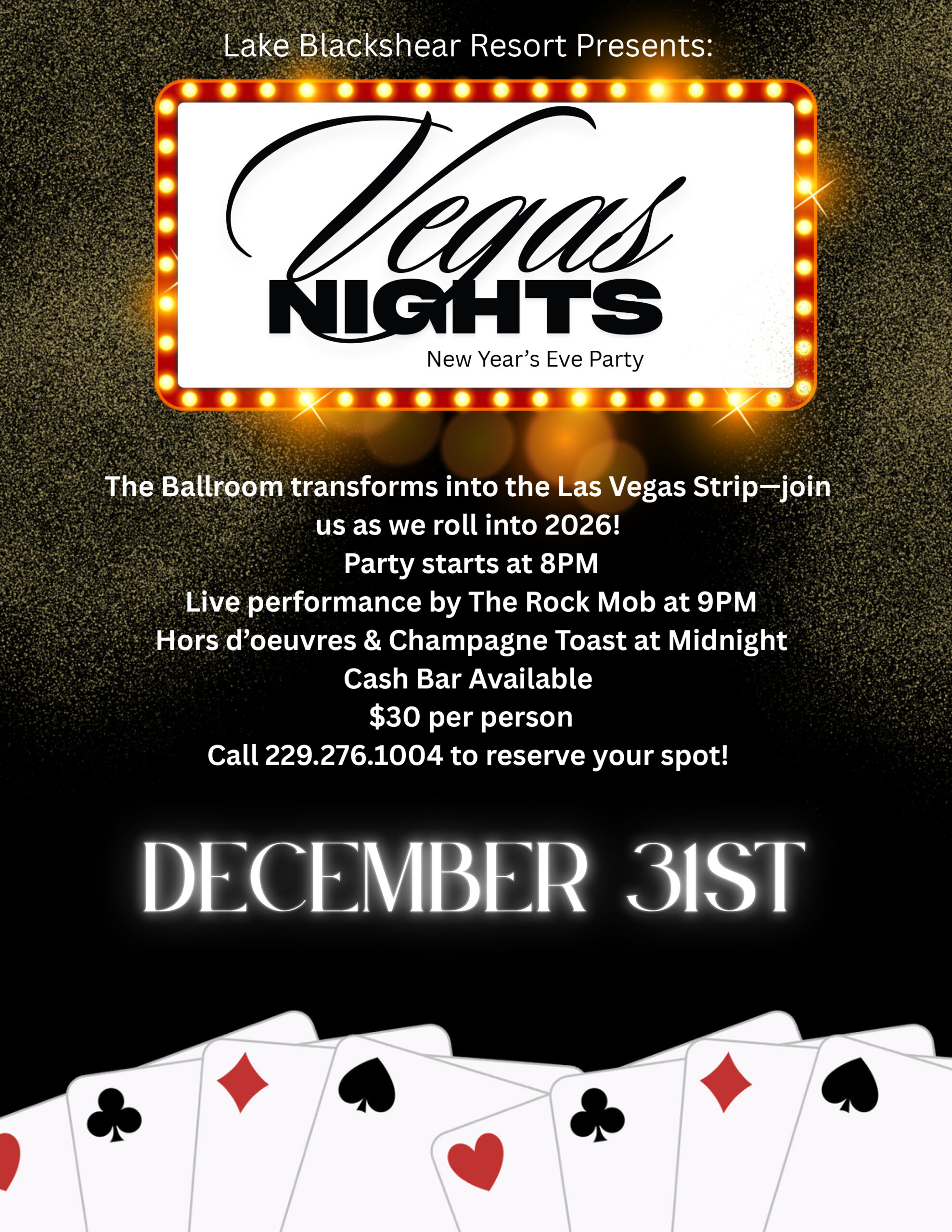 Ring in the New Year with us on December 31, 2025 as the Ballroom is transformed into the Las Vegas Strip. Door open at 8pm. Live performance by The Rock Mob begins at 9pm. Hors d’oeuvres & champagne toast at midnight. Cash bar available. $30 per person.