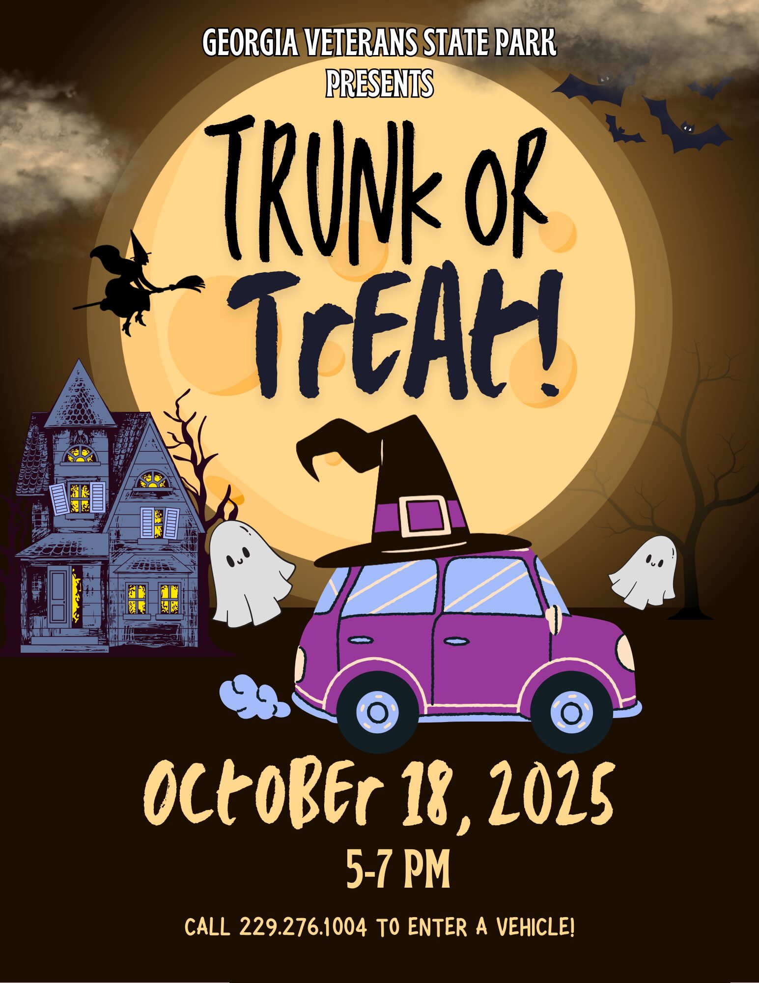 Join us for a very special Trunk or Treat event at Georgia Veterans State Park on Saturday, October 18, 2025 from 5pm – 7pm. Call 229-276-1004 to enter a vehicle ahead of the event.