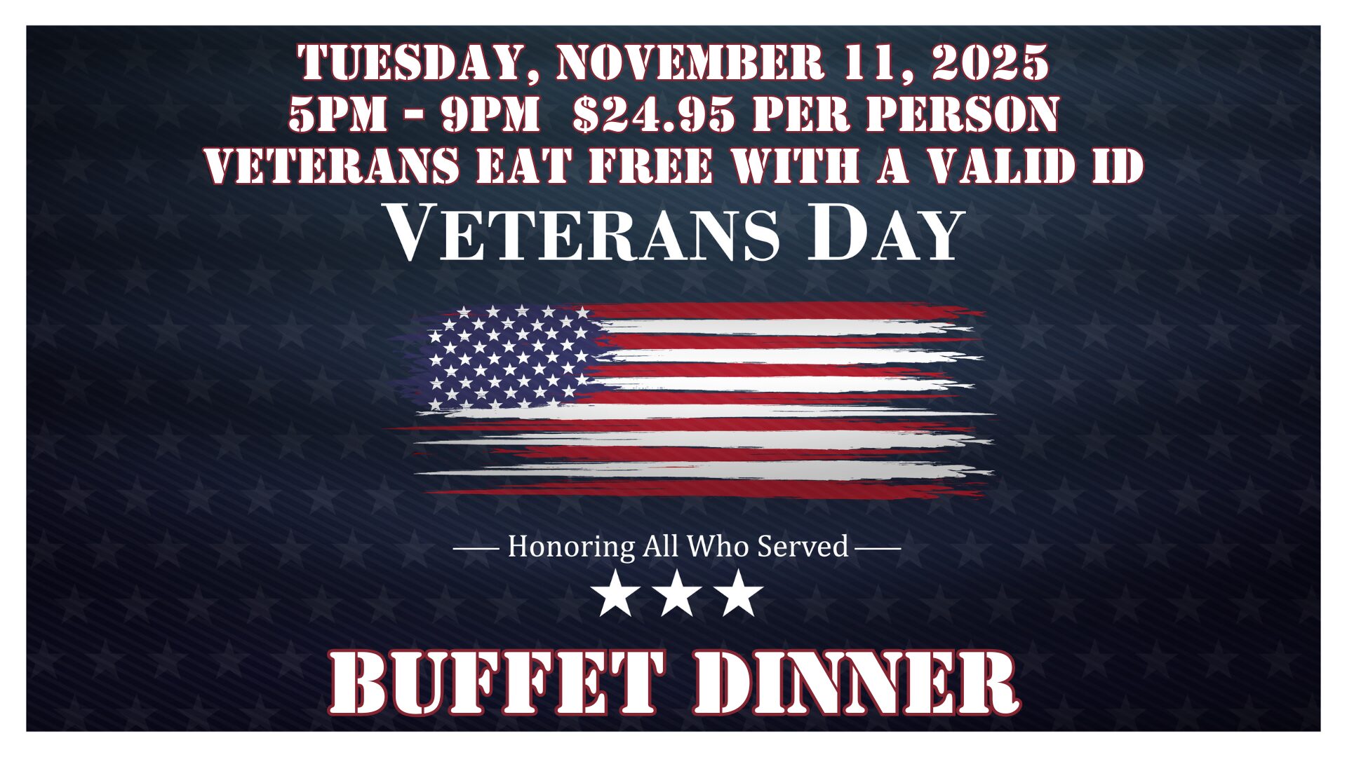 Join us in Cypress Grill for a special Veterans Day Dinner on Tuesday, November 11, 2025 from 5pm – 9pm. Cost of the buffet dinner is $24.95 per person. Veterans eat free with valid ID.
