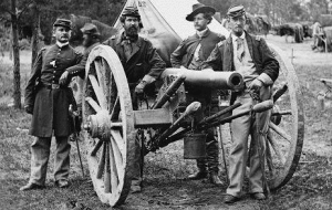 Behind the Special Collections case is a 3-inch cannon located in front of the painting of Kennesaw Mountain. This cannon is also a muzzleloader. A gunner loaded black powder and a cannon ball at the front, exposing him to enemy fire. He used a rammer to push the ammunition and charge to the rear of the cannon. A friction primer was inserted in a small hole in the breech and attached to a heavy string, which was pulled to set off the charge.