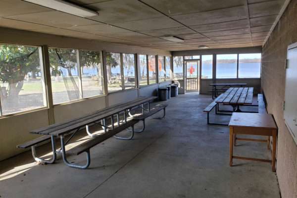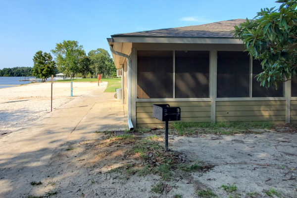 The Beach Shelter is both screened in and covered and sits next to the beach. It can accommodate up to 5 picnic tables has 1 electric outlet, outside water and an outdoor grill. The Beach Shelter can easily accommodate up to 15 people and is $100 per day to rent.