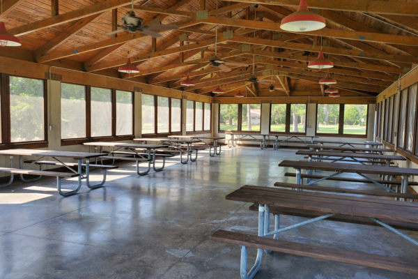 These open-air, covered shelters include 6 picnic tables, 1 electrical outlet, water and a grill. Each picnic shelter can easily accommodate up to 20 people. Cost is $55 per day to rent.